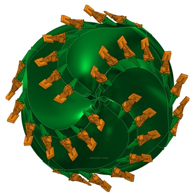 Scooping effect due to the closed blade system. Any material cut will be trapped inside the blades and lead toward the suction pipe. The airfoil shape of the cutter blades accelerates the material toward the hub of the cutter instead of outside. The mixture flow generated by the dredge pump is lead through the blades creating a high suction velocity.
