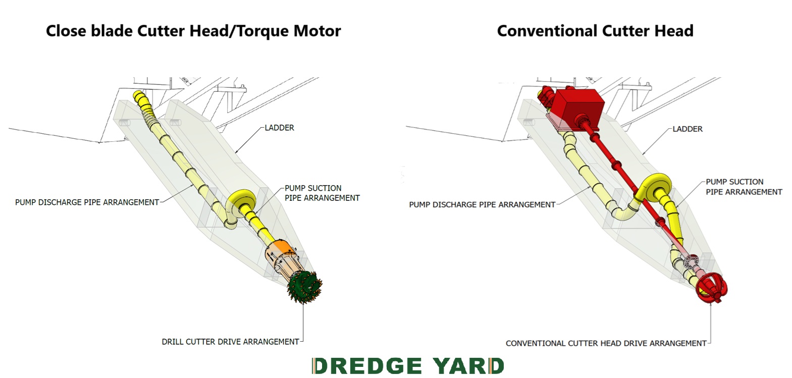 A unique feature of the electric drive cutter head is the high moment of inertia. Utilizing the center axis of rotation as a suction system, most of the weights are placed far from the axis of rotation. With this, the arrangement is much simpler and eliminates the use of expensive long shaft arrangements.