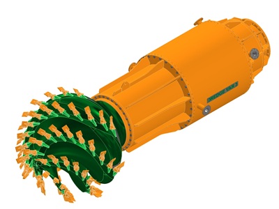 A unique feature of the electric drive cutter head is the high moment of inertia. Utilizing the center axis of rotation as a suction system, most of the weights are placed far from the axis of rotation. With this, the arrangement is much simpler and eliminates the use of expensive long shaft arrangements.